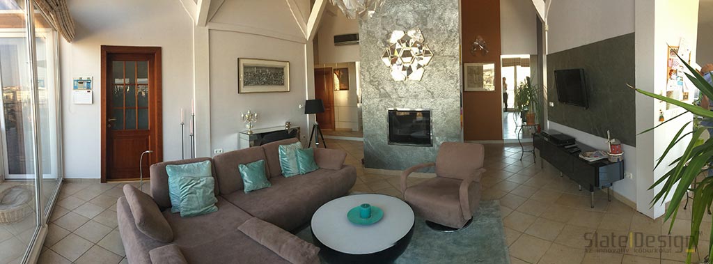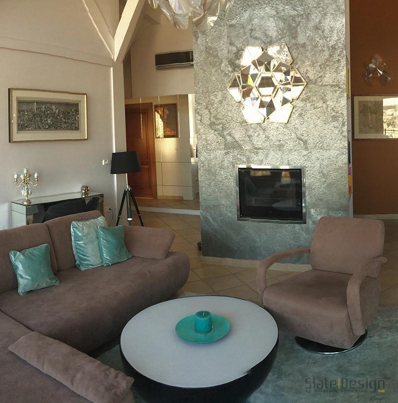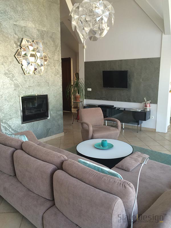 Ke znovuzrození tohoto budapešťského domu došlo na základě představ dvojice interiérových designérek Zity Bíróové a Judity Bertové, potažmo společnosti BB Design. Na povrch stěny v okolí krbu a na televizní stěnu byly použity výrazné kamenné dýhy Slate Design. Šikovným výběrem doplňků dokonale ladících se strukturou Silver Shine se podařilo vytvořit skutečně harmonický domov.